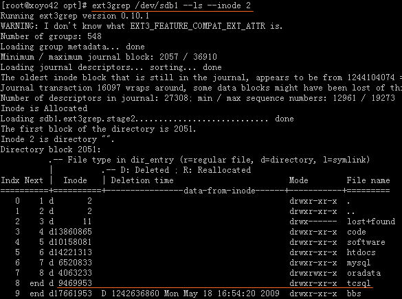ext3grep /dev/sdb1 --ls --inode 2