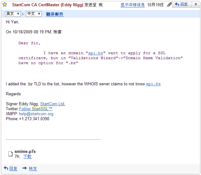 StartSSL虽然提供的是免费的SSL证书,但服务态度是非常不错的。之前StartSSL并不支持.bz结尾的域名,因为我有一个api.bz域名需要SSL证书,所以我发了份邮件给StartSSL的管理员,要求增加.bz域名,中间还因为.bz域名注册机构对whois查询有限制,出现了一些比较麻烦的问题,最终StartSSL通过修改程序,支持了.bz域名。